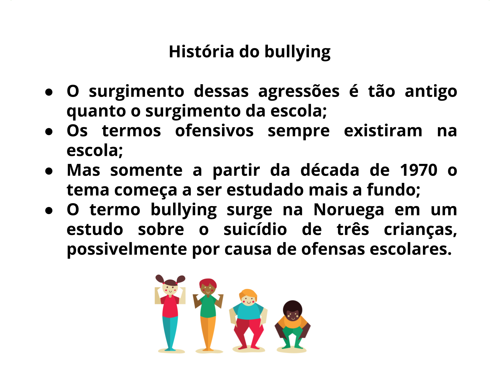 O bullying é definido como um tipo de comportamento intencional que visa prejudicar ou incomodar a vítima, ocorrendo repetidamente ao longo do tempo e envolvendo um desequilíbrio de poder, com o aluno mais poderoso atacando o menos poderoso. Pode assumir formas físicas, verbais ou psicológicas.