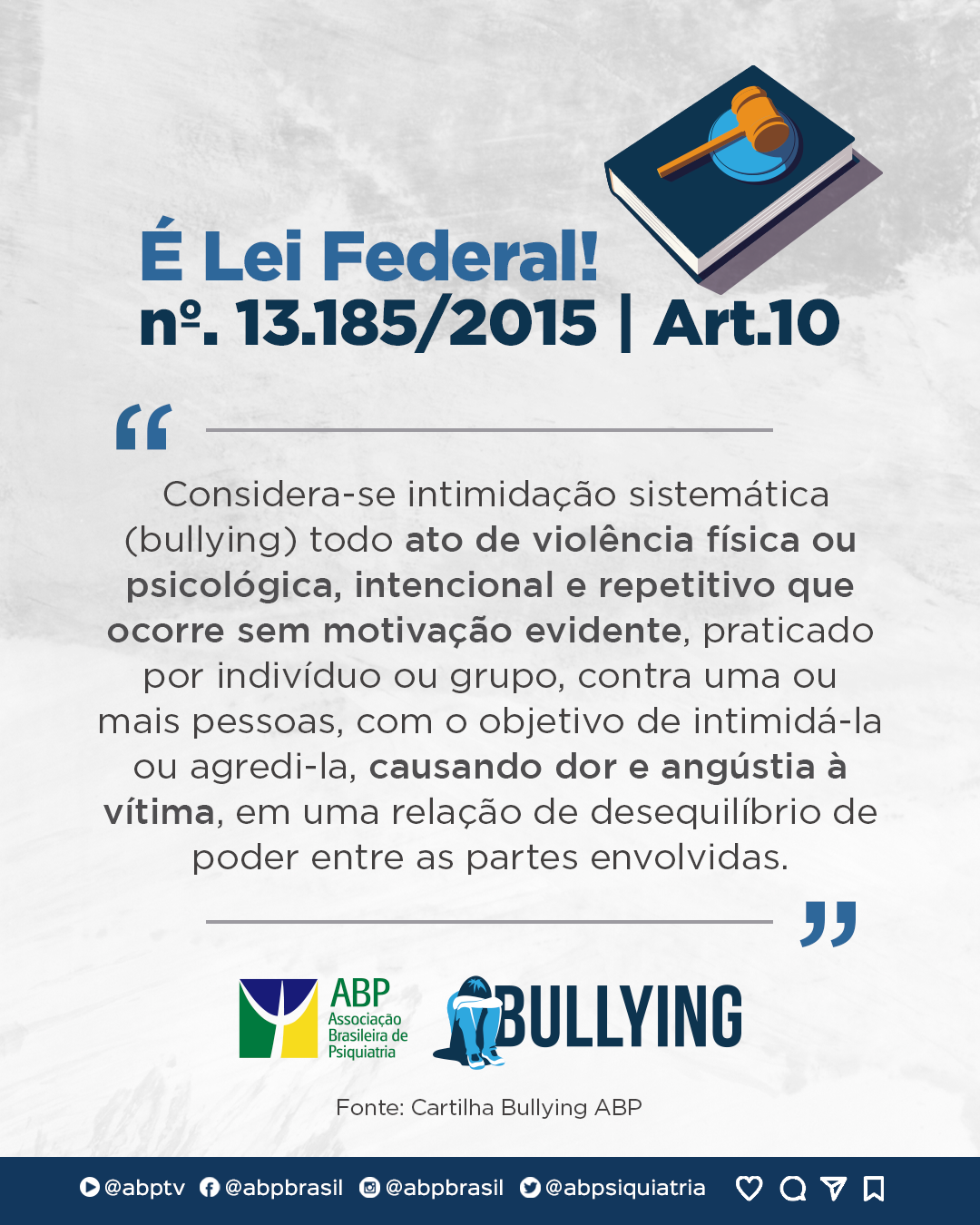 No Brasil, o bullying é regido pela Lei 13.185/2015, que institui e define legalmente essa prática, além de estabelecer mecanismos para sua prevenção e combate. A lei abrange diferentes tipos e classificações de bullying, como o assédio moral, físico, psicológico e cibernético.